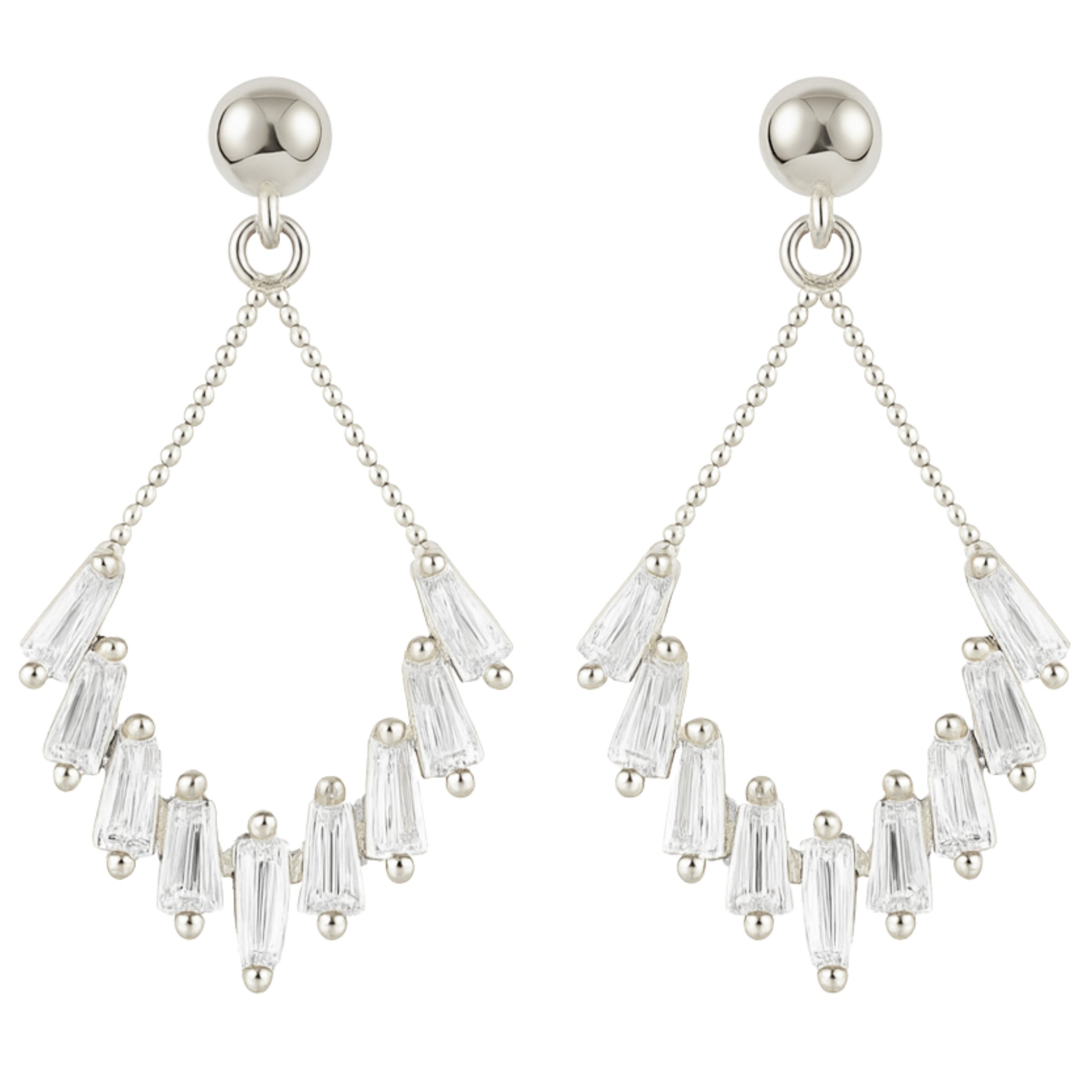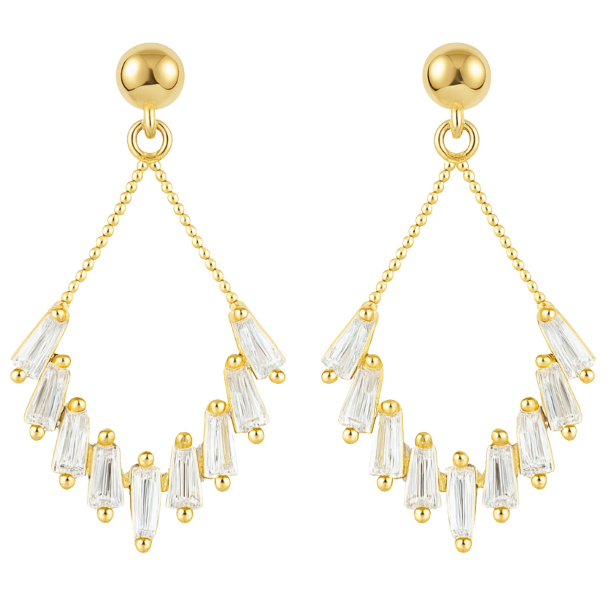 Rhodium Plated sterling silver, 1.25" Drop set with Synthetic Diamond Baguettes, Gold is plated with 14k Gold Plate. Hypo Allergenice