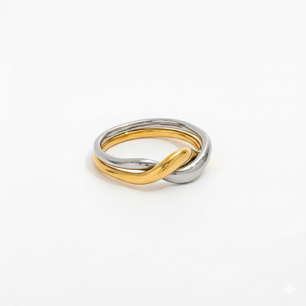 The Meridian Ring: Elevate your everyday with a piece designed to move with you. Crafted from high-grade, surgical stainless steel, the Meridian Ring features a striking two-tone interplay of gold and silver finishes. Its organic, intertwined silhouette offers a sculptural look that is as resilient as it is refined. Engineered for longevity, this tarnish-free piece is designed to be worn, loved, and lived in—without ever losing its luster.