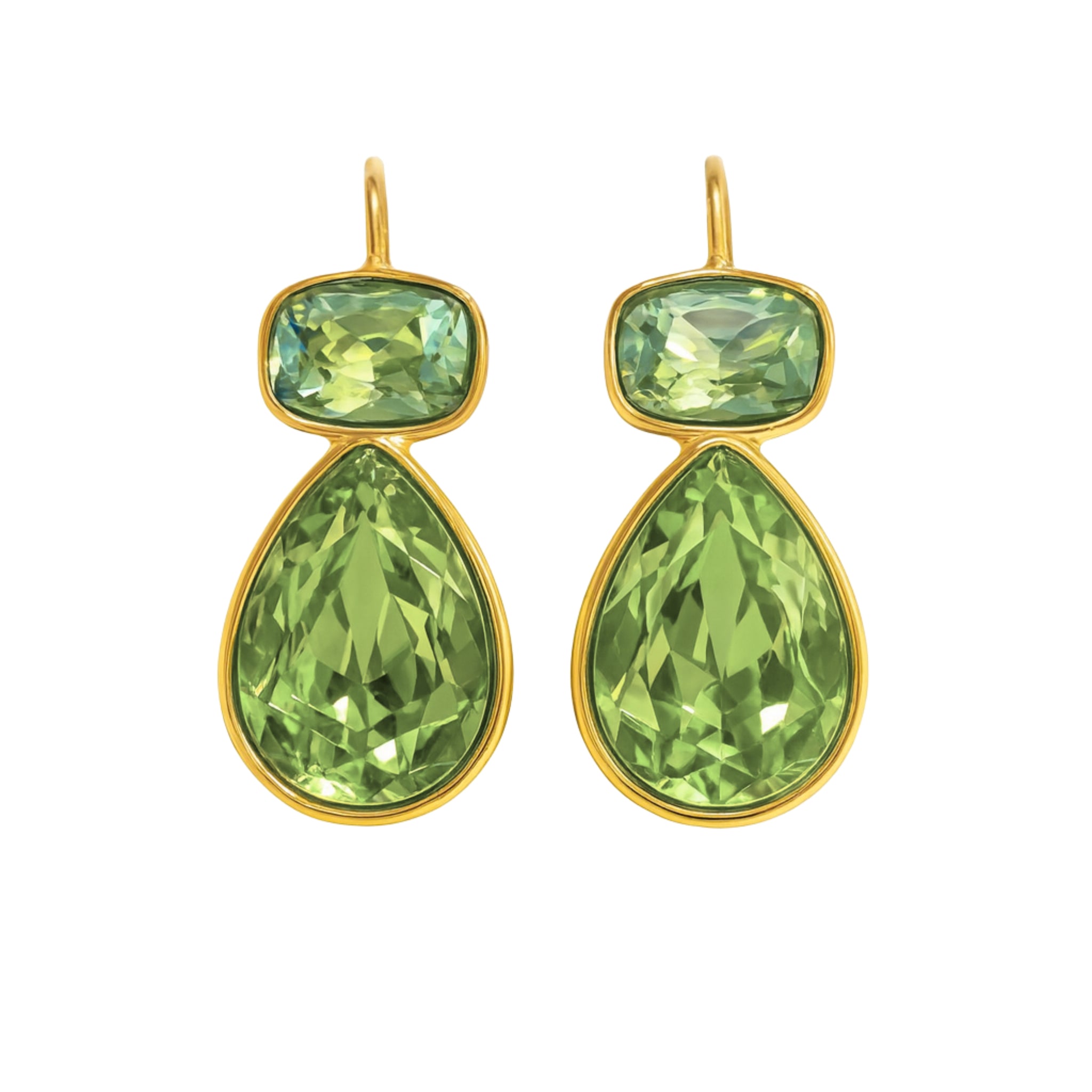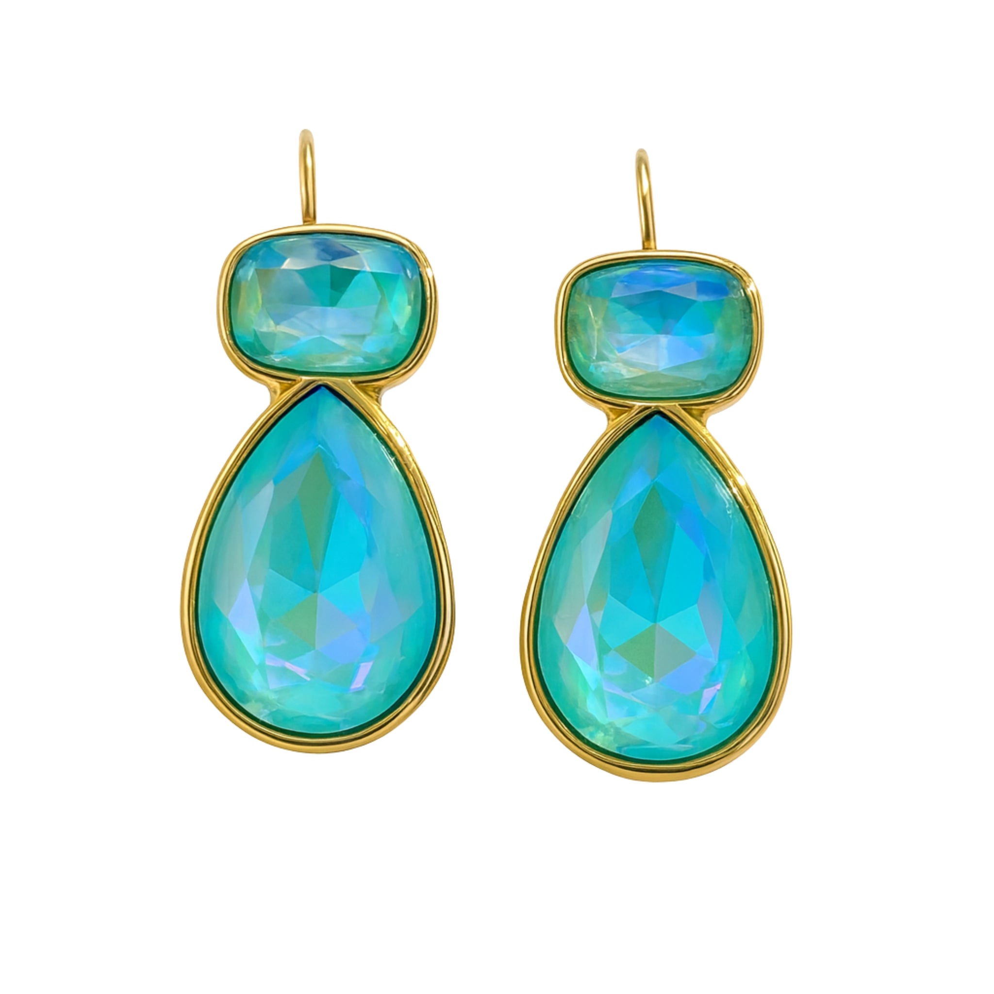 Indulge in luxurious elegance with our Big Sparkle Earrings in a vibrant blue hue. The cushion and pear set bezel stones, in a translucent turquoise color, effortlessly add a touch of sophistication to any outfit. Elevate your style with these mesmerizing statement earrings. 1" x .5" approximate, waterproof tarnish free.