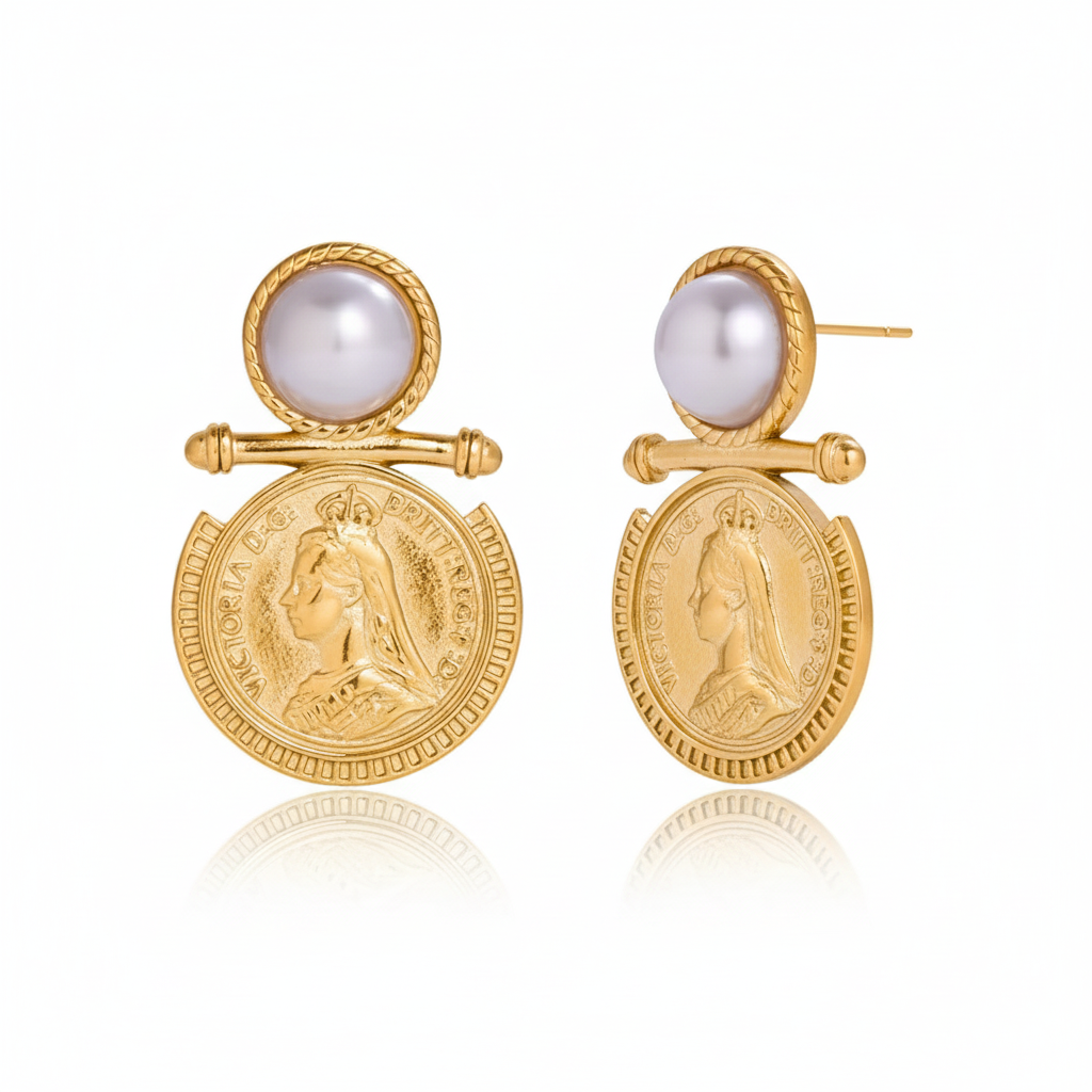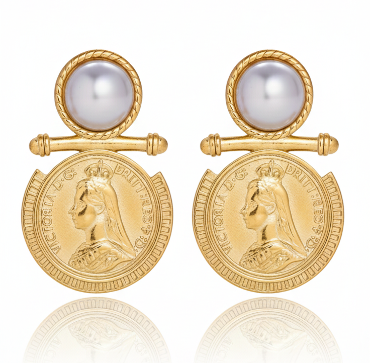 Timeless Heritage Meets Modern Durability Elevate your everyday style with the Queen Victoria Coin Pearl Earrings, jewelry that beautifully bridges the gap between antique charm and contemporary craftsmanship. Designed for the woman who loves jewelry with a story, these earrings combines historical iconography with the lustrous beauty of the sea.