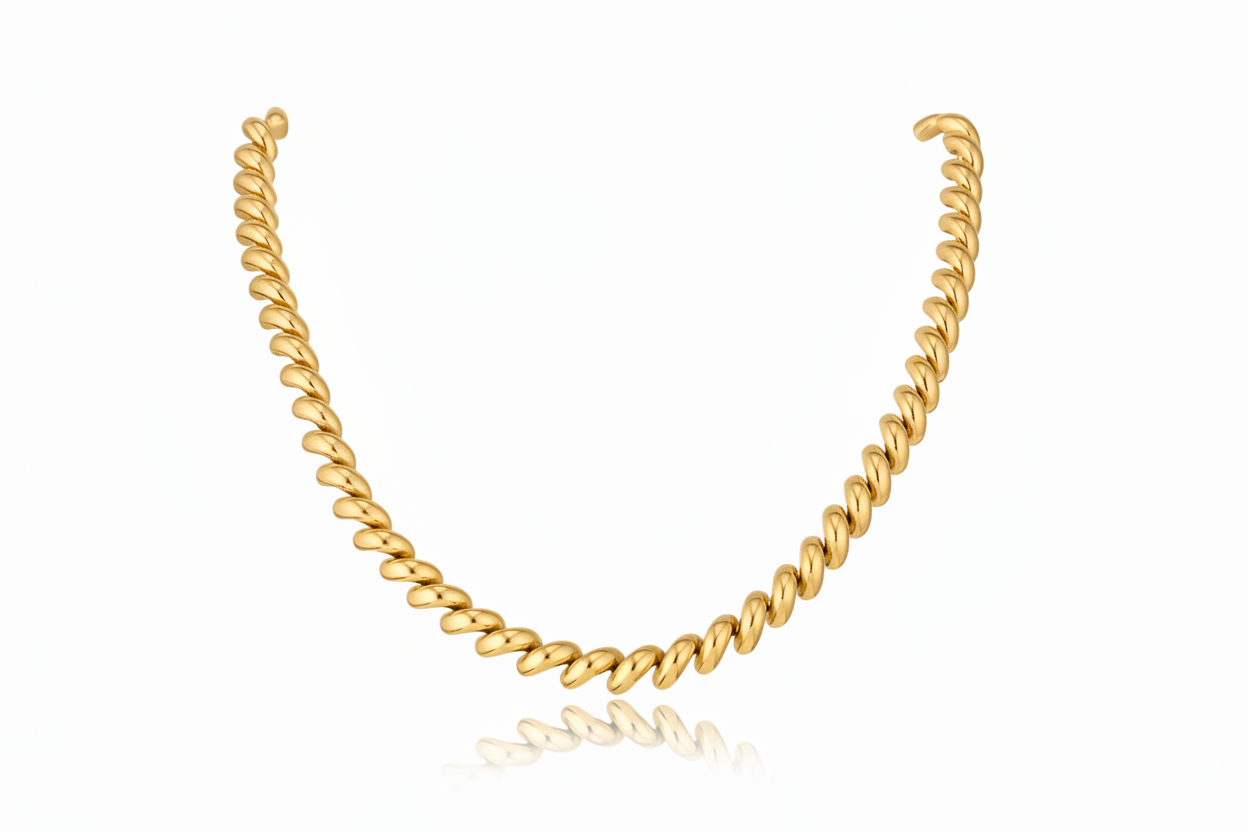 Experience the perfect blend of architectural design and timeless luxury with our San Marco Necklace. This piece is a stunning recreation of the classic Venetian style, known for its iconic interlocking, semi-circular links that mimic the arched bridges of Italy. The domed, ribbed segments are designed to catch and reflect light with every movement, providing a "liquid gold" effect that sits perfectly against your collarbone.